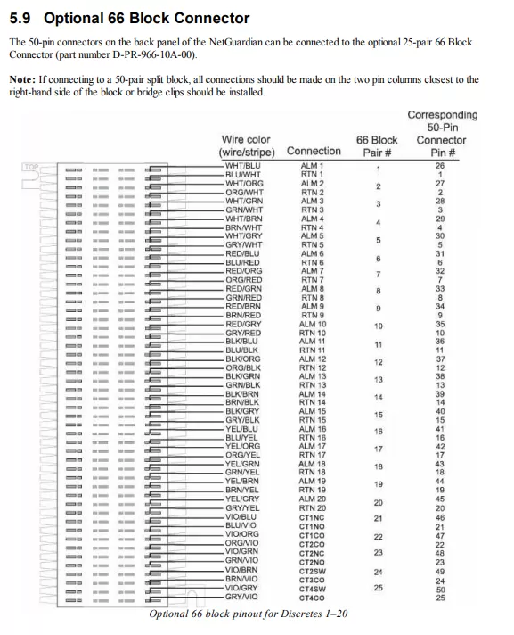 Keep in mind, though, when attaching the NetGuardian to 66 Block together, that the 66 Block numbering begins from the top. The count starts from the 1 pin and 26 pin. Since the pins are next to each other, you'll count in pairs. The order, then, is: 1 pin - 26 pin; 2 pin - 27 pin; 3 pin - 28 pin; and so on.
