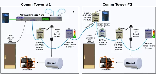 The best RTU for their scenario is the NetGuardian 420. Because we have two different sites that are somewhat close to each other, we could use a d-wire daisy chain to link both sites to the same RTU. This remote is responsible for monitoring things such as door sensors and generators.