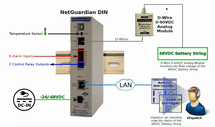In this network we just have a NetGuardian DIN and a 0-60VDC d-wire sensor that are monitoring the 48VDC battery string.