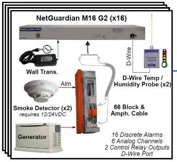 The first part of this this system will be applied for 16 out of the 20 sites. It will start with a generator sending contact closures into a 66 Block. Those contact closures can alert some issues, such as problems with the oil pressure and overheating. There is also two smoke detectors working with this 66 Block. The information about those alarms travel through an Amphenol Cable until the NetGuardian M16.